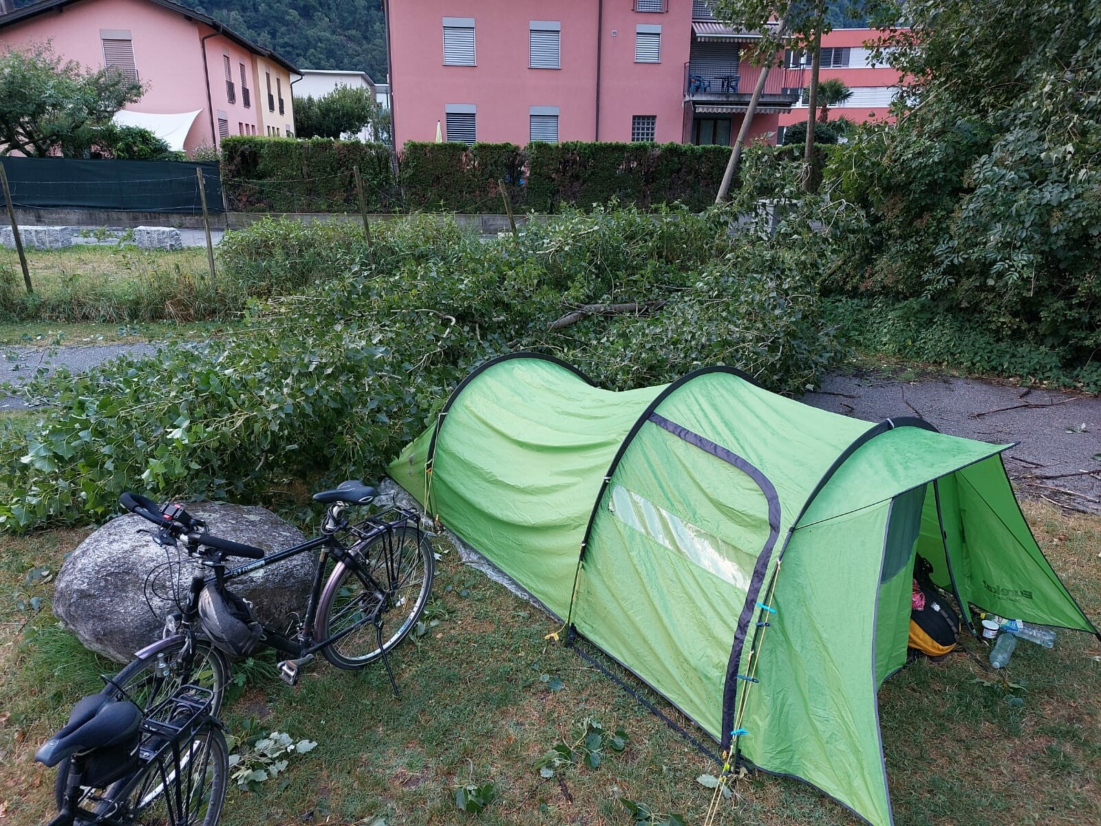 M'n ouders en broertje/zusje zijn er op fietsvakantie. Midden in de nacht wakker geworden van het onweer en gaan schuilen in het sanitairgebouw. Niet veel later stort een boom neer bovenop de tent.