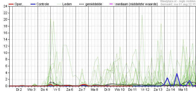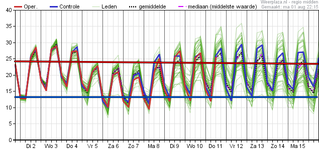 Komende dagen een stuk warmer dan gemiddeld voor de tijd van het jaar, tijdens het weekend juist iets koeler dan gemiddeld. Daarna weer een volgende "bult".