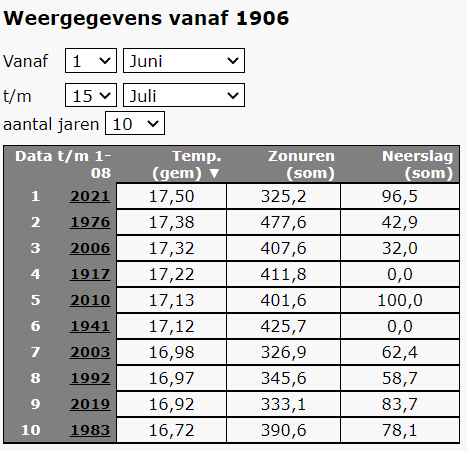Voor Eelde was toen een Tg van 14,6 °C de norm (1941-1970) van 01 juni t/m 15 juli). Het werd 17,4 °C. Dat is 2,8 °C boven het gemiddelde. Nu is voor Eelde de norm 15,9 °C, dus zul je voor een goede vergelijking uit moeten komen op 18,7 °C gemiddeld voor het tijdvak van 01 juni t/m 15 juli.
