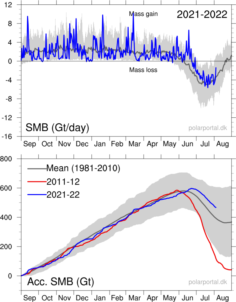 Ook Groenland lijkt een gunstig jaar te hebben, tenminste als we afgaan op de Surface Mass Balance. Deze ligt nu een stukje boven het gemiddelde van 1981-2010 en zou daarmee boven de +400 Gigaton uit kunnen komen.