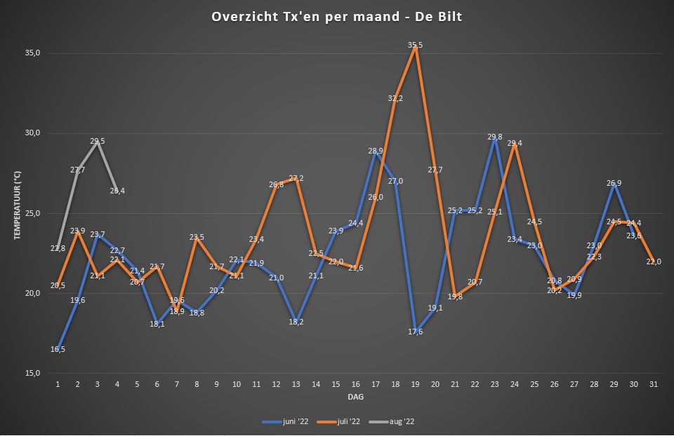 Om dit te visualiseren, heb ik de Tx'en voor De Bilt over de maanden juni en juli in een grafiek gezet.