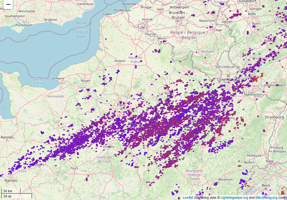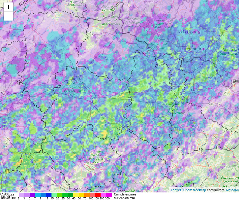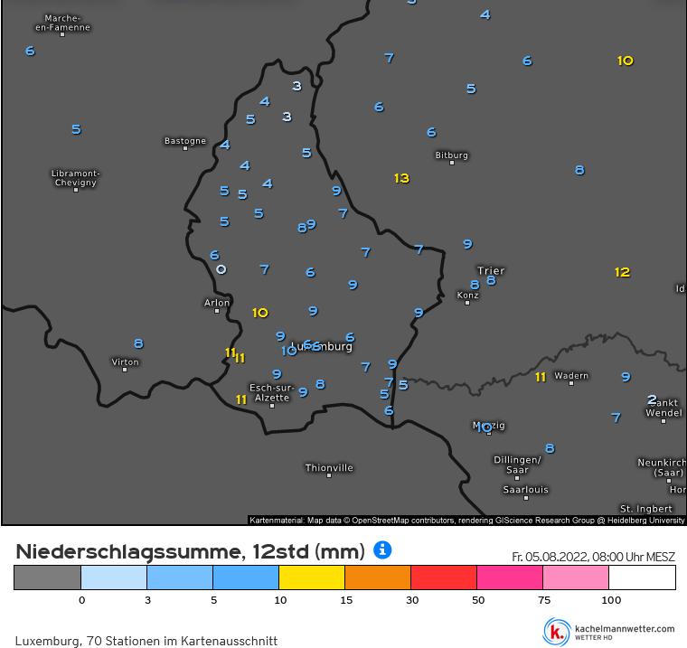 Luxemburg staat ook nog net op de kaart; dit kan vergeleken worden met de aftappingen die Kachelmannwetter geeft (tweede afbeelding). In Wiltz en omgeving 4 tot 5 mm zonder onweer. In het zuiden van het land tot ruim 10 mm, met tegen de franse grens net wat onweer. Zie de derde afbeelding, maar lightningmaps geeft vaak een onvolledig beeld van het aantal ontladingen. Ze verdwijnen regelmatig na een minuut of twee van de kaart.