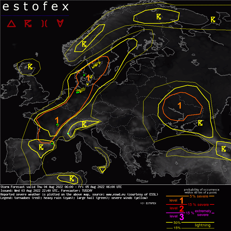Meldingen van hagel of windstoten uit noord Frankrijk heb ik nog niet gezien, ook niet bij de ESWD. Bij Estofex is er alleen in andere delen van het level-1-gebied wat aangetekend als verificatie. Uiteraard bij Bremen, wat hier gisteren al genoemd is, en ook in zuid Zweden, waar ik zelf iets over gepost heb. Zie de vierde afbeelding.