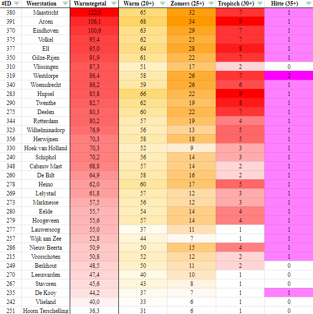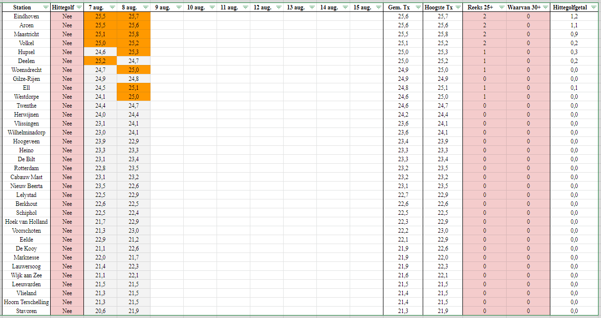 Onderaan is een overzicht te zien van de (mogelijke) hittegolf die eraan zit te komen. Direct na de naam van het station is te zien of aan de voorwaarden voor een hittegolf is voldaan. Daarachter komen de dagelijkse maximumtemperaturen (zomers = oranje, tropisch = rood). Rechts zie je de gemiddelde en hoogste maximumtemperatuur per station, daarna de langste reeks zomerse dagen en hoeveel daarvan tropisch waren. Tot slot ook nog het hittegolfgetal (soort warmtegetal, maar dan gerekend met maximumtemperaturen vanaf 25 graden).