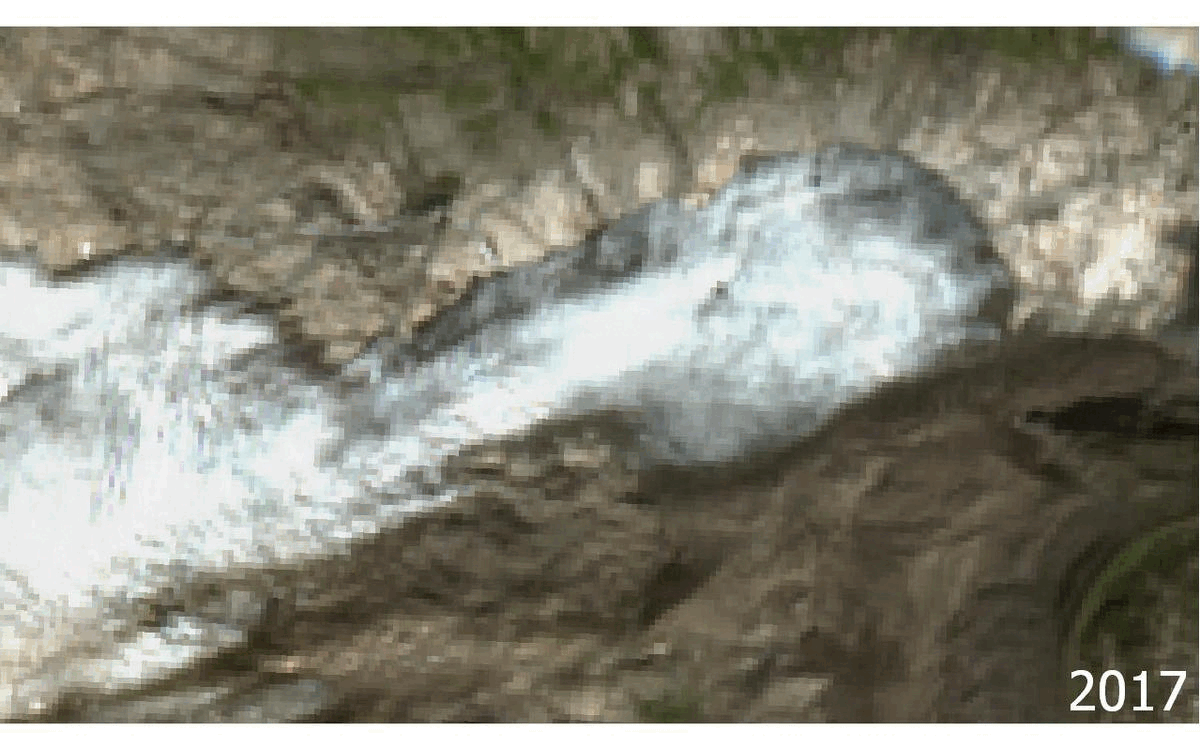 De Schlatenkees ligt ten oosten van de Grossvenediger en is ongeveer vijf kilometer lang. Rond 2700 meter duikt de gletsjer steil omlaag. Beneden, tussen de 2300 en 2400 meter, is de tong juist heel vlak. Door klimaatverandering wordt het steile deel steeds smaller. Dat is in onderstaande gif goed te zien. De satellietfoto's zijn genomen in de jaren 2017-2022, telkens in augustus. Duidelijk te zien is dat de tong uit elkaar valt. Dat gaat des te sneller omdat de tong in een laagte ligt, waar water blijft hangen. In plaats van ijs ligt er een groter wordend meer.
