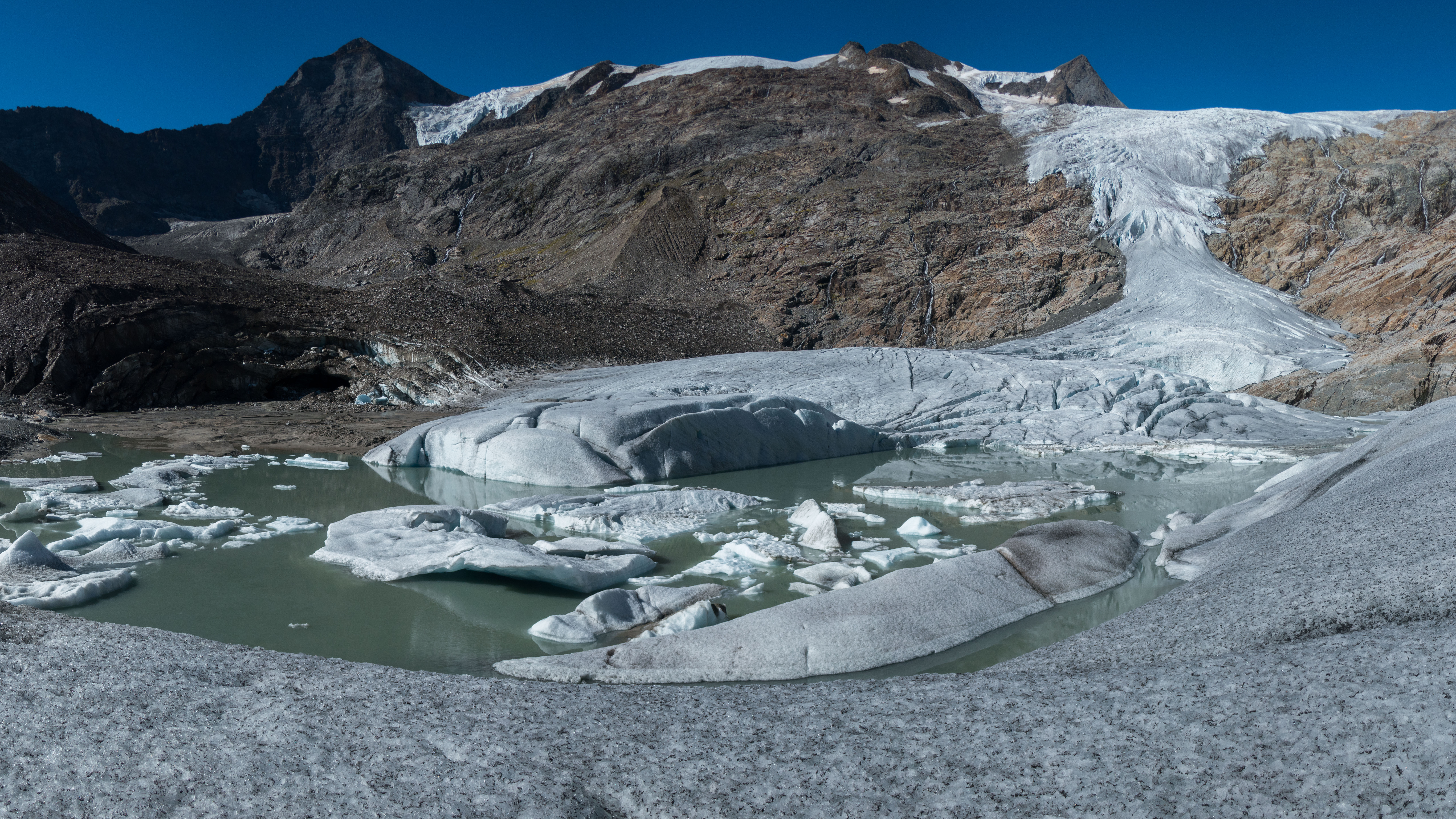 Bij de Alte Pragerhuette is het nog een klein stukje dalen naar de gletsjer. En weer een stukje omhoog, want het terugtrekkende ijs laat een kaalgeschrapen landschap achter dat nog moet worden doorkruist (geen markeringen) om aan de rand van het proglaciale meer te komen. Dat is zeer de moeite waard: de dunne ijsval rijst vanuit het water hoog op en in het meer liggen prachtige ijsbergen. Zie onderstaande vier foto's.