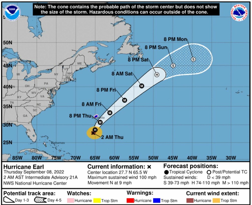 en zal zich ontwikkelen tot een major hurricane. Dat blijft zo tot even boven de 40e breedtegraad. Bijzonder! Daarna staat Earl ingetekend als een niet-tropische hurricane. Ook dat is apart. Het zal wel te maken hebben met de hoge temperatuur van de noordelijke Atlantische oceaan.