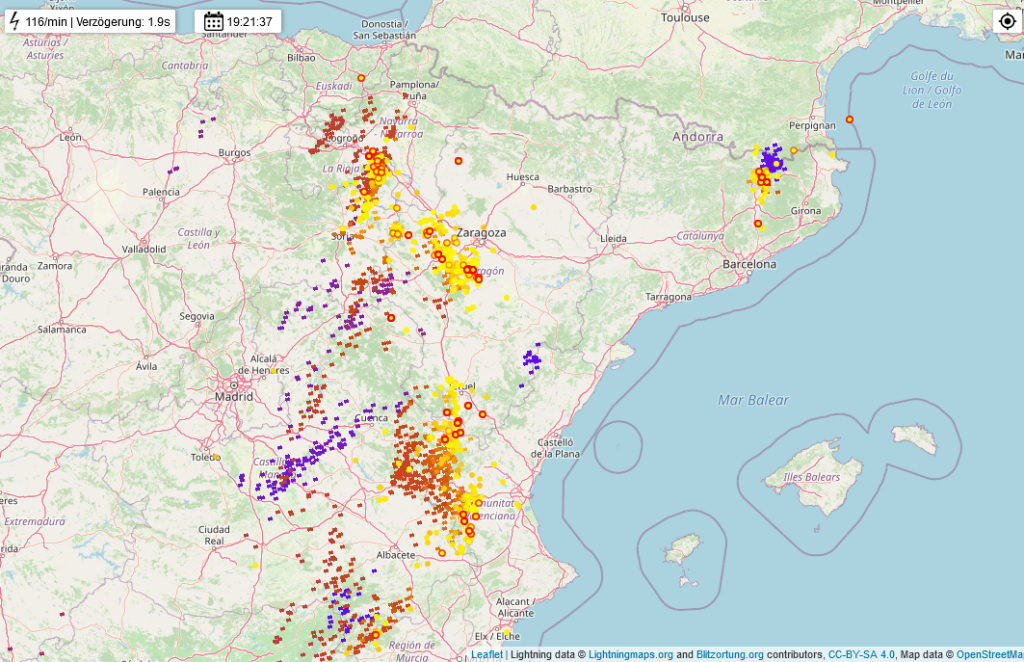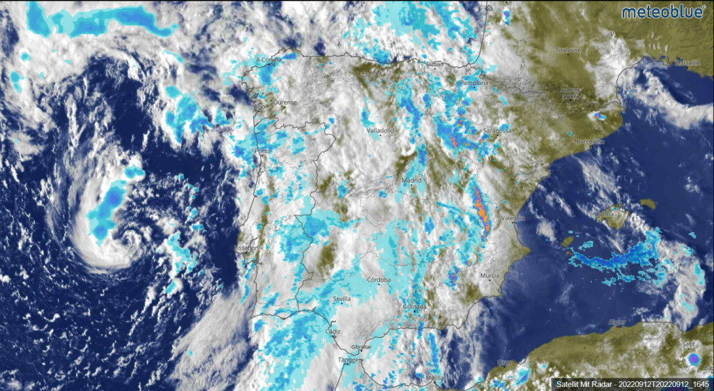 Op dit moment komt het tot min of meer georganiseerde onweerbuien in het noordoosten van Spanje. Deze worden op aftsnad aangestuurd door de restanten van (sub-) tropische storm/orkaan Danielle, die nu een eind voor de kust van Portugal ligt. Dit proces gaat ook morgen nog door.