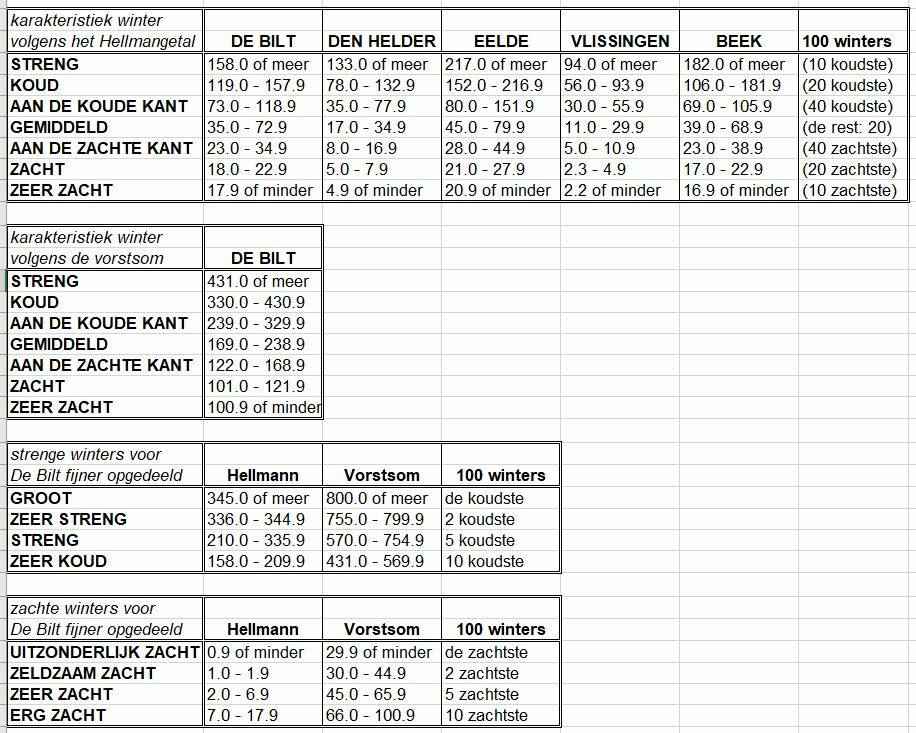 .. dat heb ik gemaakt op basis van de winters uit de 20e eeuw. Iets veranderen is namelijk wel wenselijk, want volgens het KNMI hebben we nog steeds een 'normale' (gemiddelde) winter als die bijvoorbeeld 98 Hellmannpunten oplevert! Die grens stopt namelijk bij 100 Hellmannpunten.