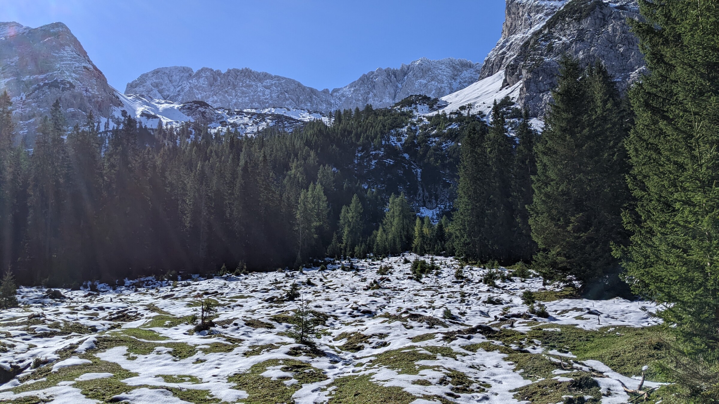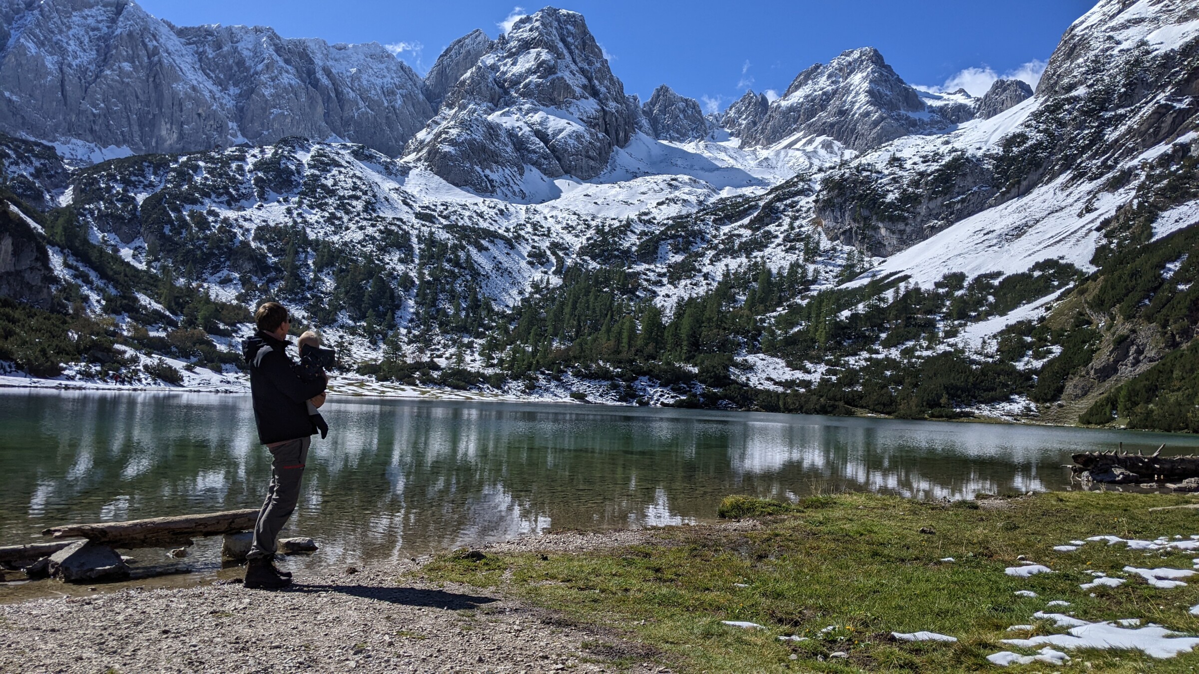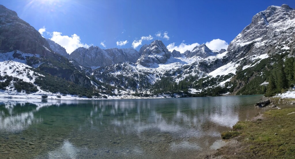 De seebensee ligt 150 meter hoger dan de Ehrwalder Alm waar we met de gondel konden uitstappen. Het was toch een wandeling van 2 uur er naar toe, omdat het ook omhoog en naar beneden gaat, dus je maakt meer hoogtemeters. Vanaf 1550meter lag er al sneeuw, omdat de route grotendeels aan de schaduwkant loopt van de bergen naast de Zusgpitze. In de schaduw vroor het ook, waardoor alles mooi wit werd onderweg. vanaf 1600 meter dan ook een gesloten dek, terwijl aan de zonzijde van de berg de sneeuwgrens een paar honderd meter hoger lag. Aangekomen bij de seebensee was het kraakhelder, en deed de aanblik winters aan. Wat een paradijs daar...ik ben er wel eens in de zomer geweest, maar nu met de sneeuw was het werkelijk fantastisch.