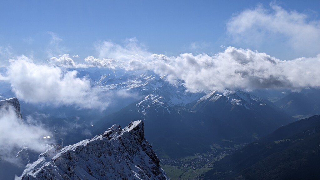 De Zugspitze vandaag, met uitzicht op Lermoos en de berg de Grubigstein.