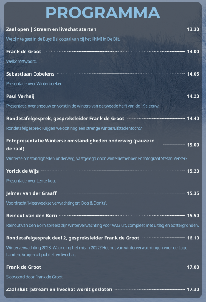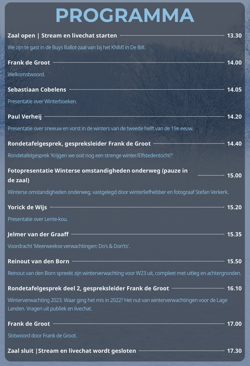 Met de huidige interessante LT-kaarten is het misschien wel éxtra leerzaam om de wintermeeting bij te wonen! Met een mooi programma, en goede gesprekken over de komende winter met Frank en top-meteorologen, klimaatkenners en -specialisten.