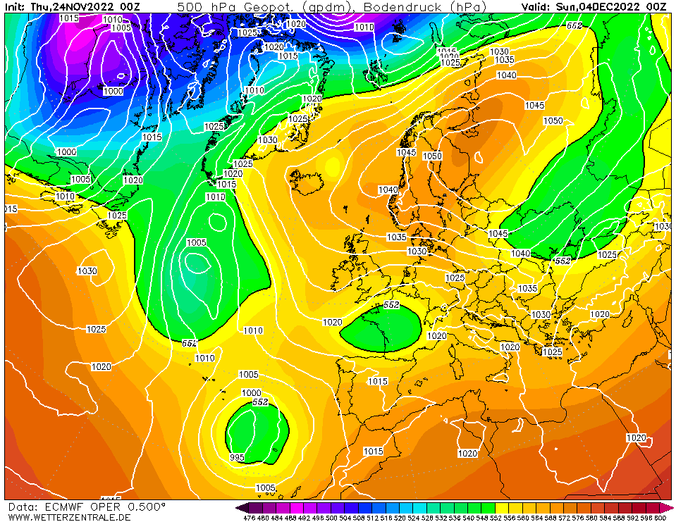 Door constante WA op de oceaan een wat westwaarts verplaatsend hoog. Pas na deze kaart eventueel echte kou. Daarvoor natuurlijk al wel fris/koud.