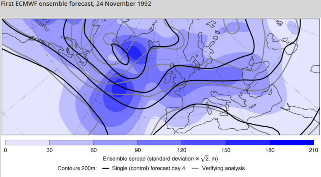 24 november 1992 werden voor het eerst in het ECMWF (en een maand later in Amerika) ensembleverwachtingen geproduceerd. De eerste EPS had 33 leden met een resolutie van 210 km (vergelijk: 50+1 leden nu met een resolutie van ongeveer 18 km en 9 km voor de ene deterministische run; volgend jaar wordt de resolutie voor alle leden 9 km).