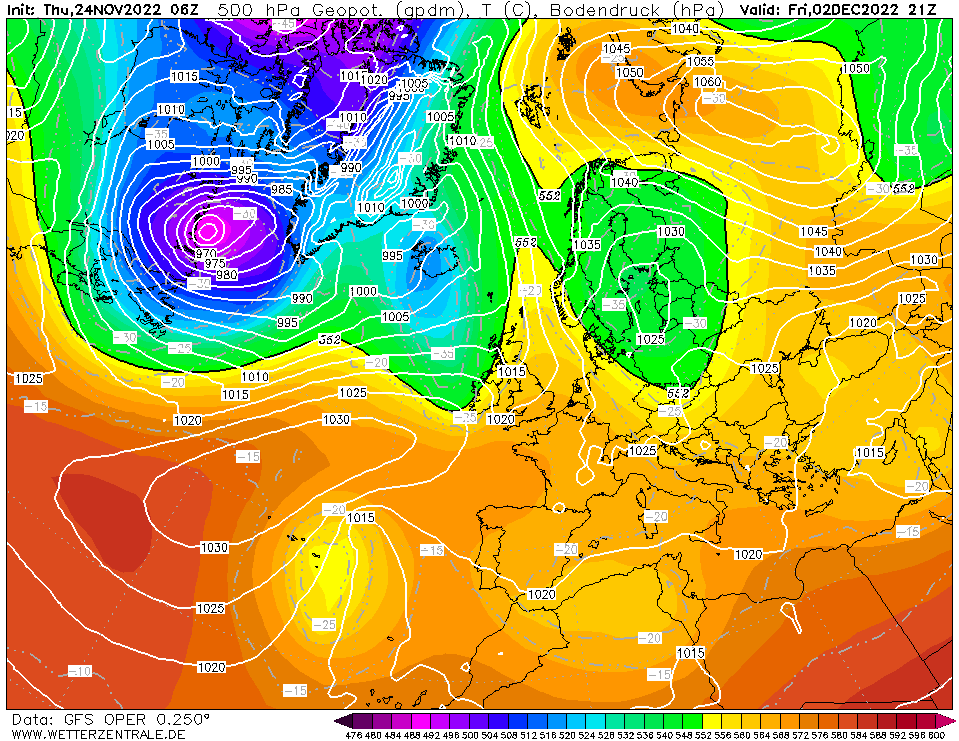 Stroming blijft overwegend zuidelijk, ondanks ontwikkelingen in het noorden. Wel rustig weer doordat er niet veel schot in de atmosfeer zit maar lagere temperaturen zitten er nog niet in.