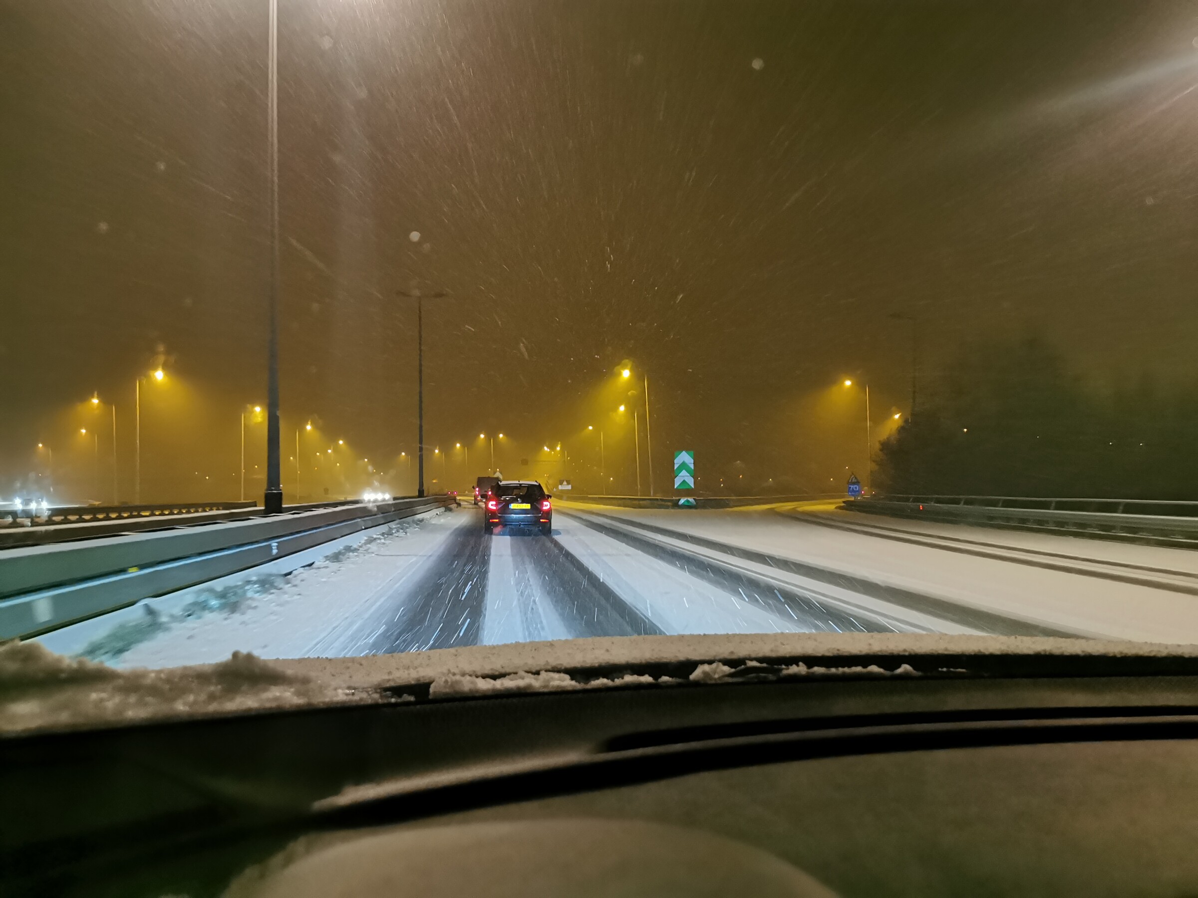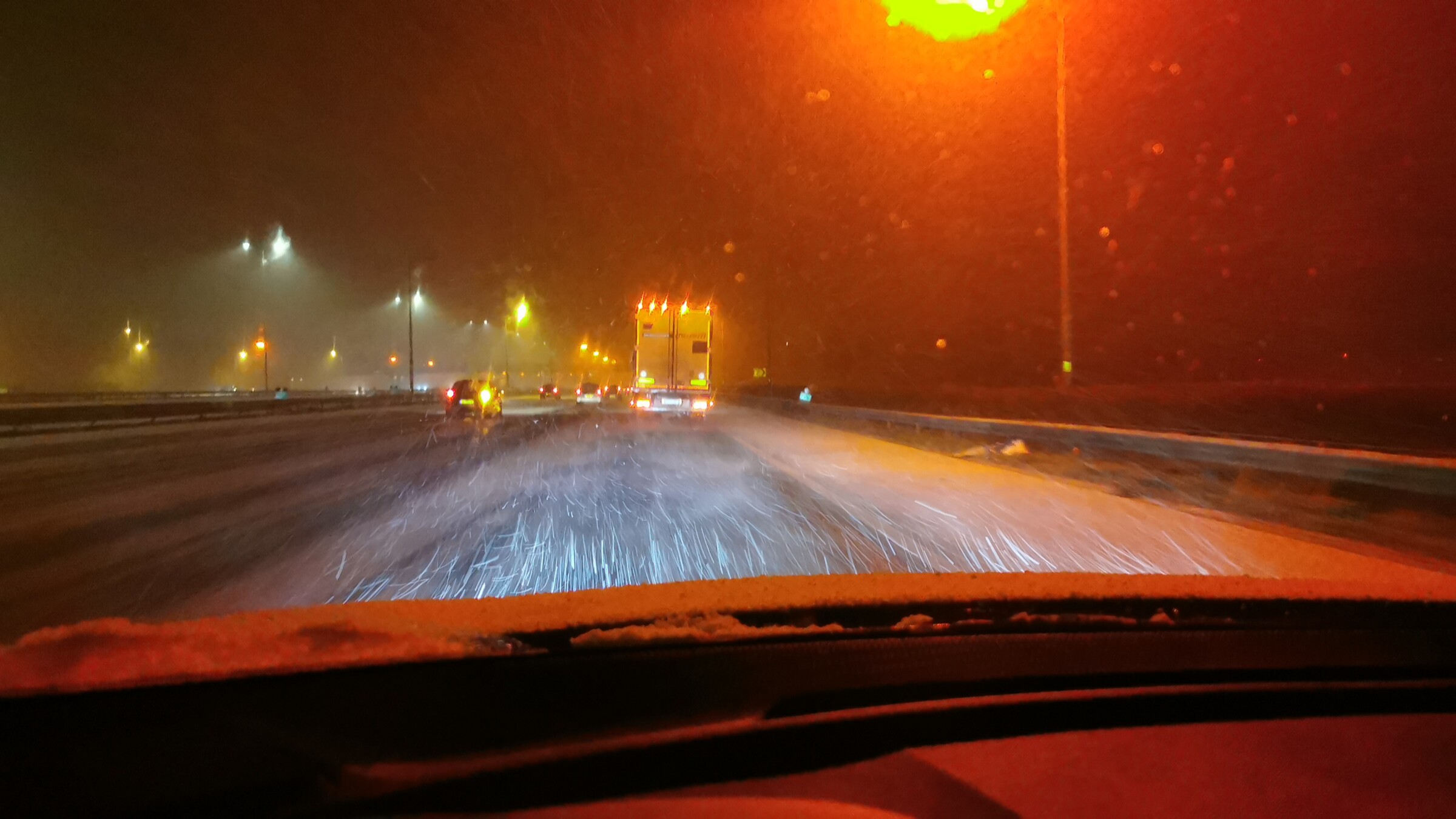 Vanaf Ahoy de snelweg op. Helaas kan ik geen filmpjes uploaden. Het was goed glad en daardoor gelijk 2 auto's in de vangrail. Nu in ambacht waar het ook begint te sneeuwen.