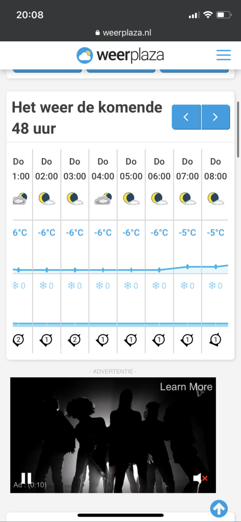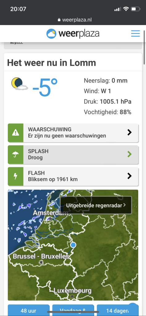 Het is hier al onder de -7 maar Weerplaza denkt dat het -5 is en komt gehele nacht niet lager dan -6. Tja….dat is toch wel erg slordig. En het gebeurt veel vaker. Werk aan de winkel voor de automatische systemen van WP dus.