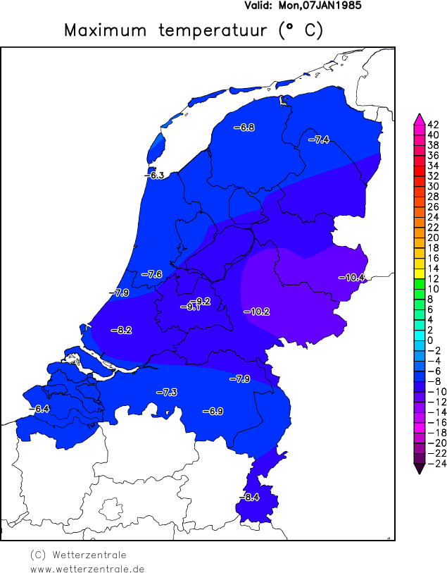 Steenwijk: Maandag 7 januari 1985, Tmin: -17,1°C, Tmax: -8,1°C. Tgem: - 12,1°C. Zo nu en dan lichte sneeuwval. Onvoorstelbare waarnemingen nu in deze tijd. Ook nog tussen 2 speciale dagen in die winter. 6 januari een enorme sneeuwjacht, tegen een sneeuwstorm aan en 8 januari koudste Tn ( -18,4 °C.)die winter.