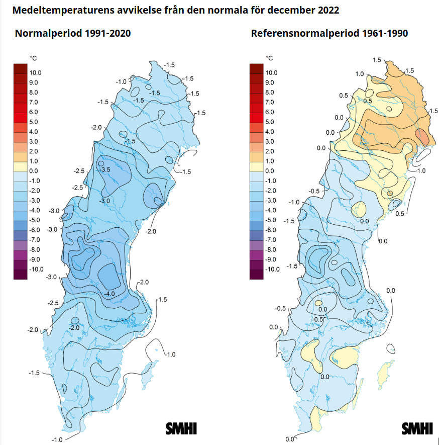 Als je die twee kaarten vergelijkt, dan zie je dat het in het noorden in 30 jaar tot 3°C warmer is geworden. Dat is veel meer dan bij ons! Hier is het net (ruim) een graad.
