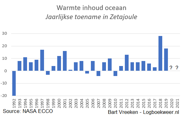 De toename gaat onregelmatig. De grootste uitschieter was een toename van 28 Zetajoule in 2018.