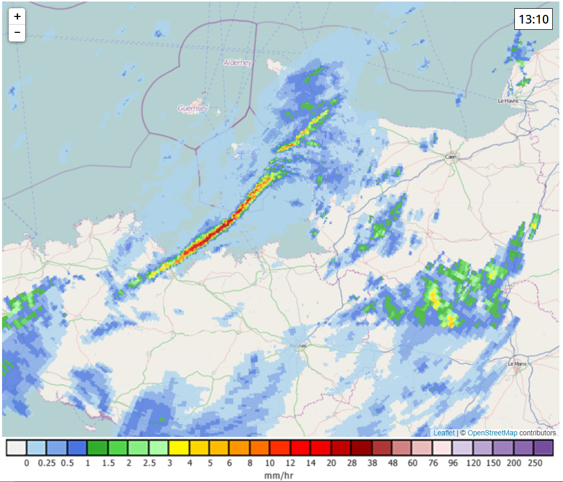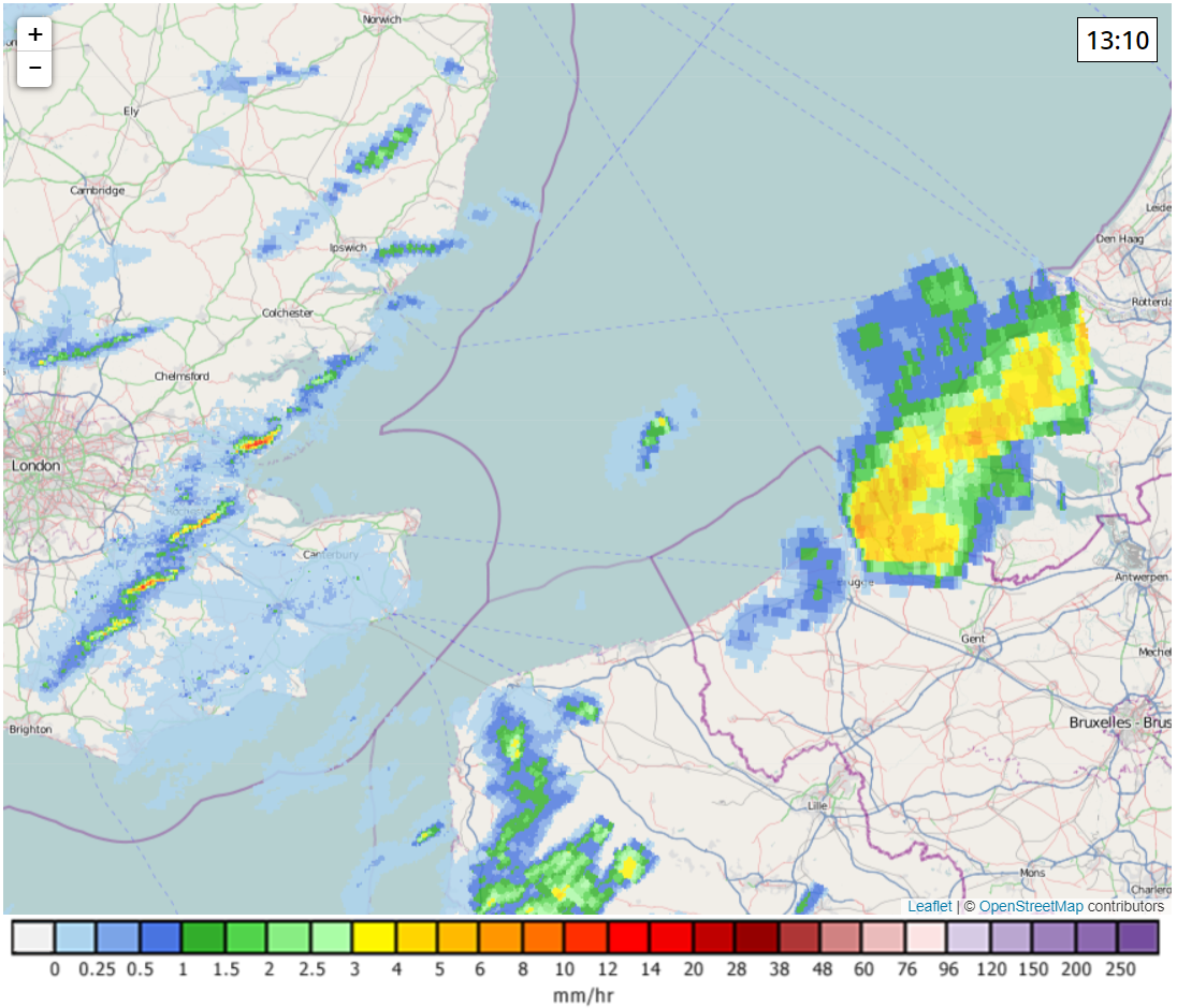 Voor de derde maal deze week zien we een buienlijn boven het ZW van Engeland liggen. De eerste twee pogingen om de oversteek te halen mislukten, maar hopelijk lukt het deze keer wel. Boven Frankrijk lijkt de buienlijn een fractie actiever te zijn (zoals de modellen ook verwacht hadden). Hopelijk activeert het stuk in onze aanvoerrichting nog wat.