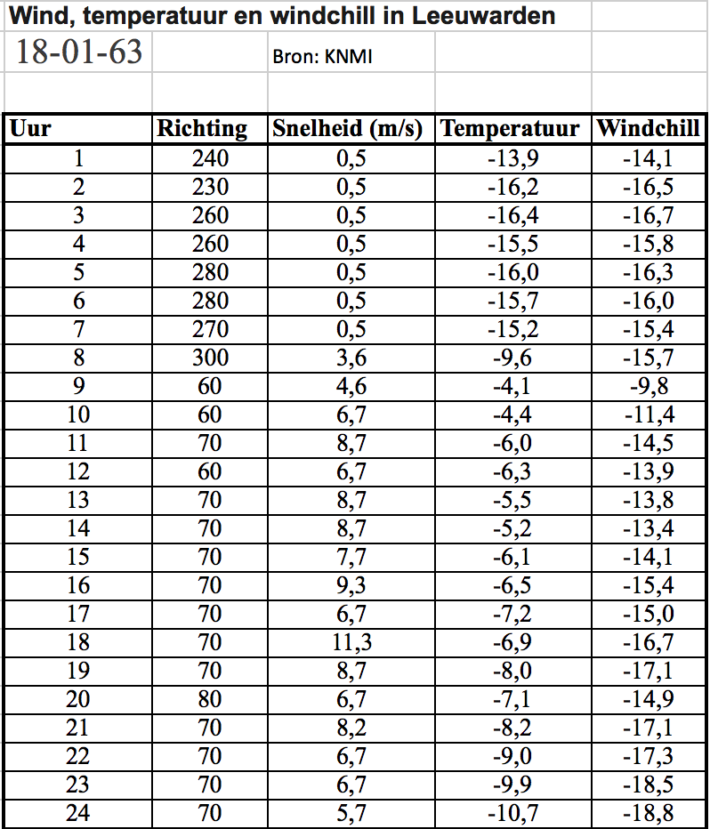 Het was vooral de wind die het winterweer extreem moeilijk maakte voor de schaatsers. In Leeuwarden liep het kwik in de ochtend eerst op tot -4. Vanaf 10 uur ging het naar beneden tot -10 rond middernacht. De wind wakkerde daarbij aan van kracht 3 om 10 uur tot kracht 5 en tijdelijk 6 in de middag en avond. Dat betekent dat de eerste uren van de tocht extreem koud geweest zijn. In Leeuwarden was het zo’n 17 graden onder 0 terwijl elders in de provincie -20 is gemeten. Op weg zullen de wedstrijdrijders in -18 tot -20 hebben gereden tussen 6 en 8 uur. Beelden van schaatsers van die eerste uren laten wit berijpte kleding zien; heel verklaarbaar uit rustige, nevelige omstandigheden met snel bevriezend vocht van uitgeademde lucht. We kunnen de windchill erbij betrekken en dan zien we op basis daarvan zeer lage gevoelstemperaturen, ook in de middag en avond. De schaatser heeft natuurlijk altijd een luchtstroom langs zich en heeft daarbij ook een natuurlijke windchill. In de tabel, die ik graag overneem van het KNMI, zien we de windchill op basis van de heersende wind van uur tot uur. (Zie Afb. 3). Bedenk dat de tijd gegeven wordt in UTC waarbij onze tijd een uur later aangeeft. Vooral de rijders die in avond nog het noordelijke deel van de tocht moesten afleggen, kregen met de eigen snelheid tegen de wind in erbij, te maken met zeer lage gevoelstemperaturen. Naar schatting, bij een rijsnelheid van 4 m/sec ongeveer -19 tot -20. De windsnelheden gelden voor Leeuwarden. In het noorden kan het nog iets meer geweest zijn.
