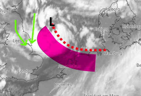 Grootste kans is dat ze oostwaarts geduwd gaat worden door het stromingspatroon in de grootschalige hoogtetrog wat kantelt, mede door een rug bij Ierland. Convergentie langs de Engelse Oostkust kan aan de actieve kant van het laagje (ZW) zorgen voor extra boost in neerslag. De paarse band de meeste neerslag de komende 24 uur (disclaimer: kleine verschuiving, grote gevolgen). Vanwege de harde wind vanaf zee echter geen sneeuwdek, zelfs grotendeels regen of natte sneeuw.