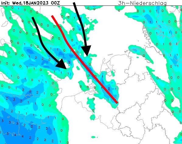Verschillende modellen laten achter het laagje echter wel voortgaande convergentie zien langs de Engelse oostkust morgenochtend. De buien kunnen dan oplijnen en clusteren, dit kan voor Zuid-NL en Noord-België (Kempen) interessant zijn. Dieper landinwaarts berekent bijv. Arpege dan wel sneeuwbuien met accumulatie. Precieze stromingspatroon bepaalt dan uiteraard waar zo'n slepende buienlijn terecht komt.