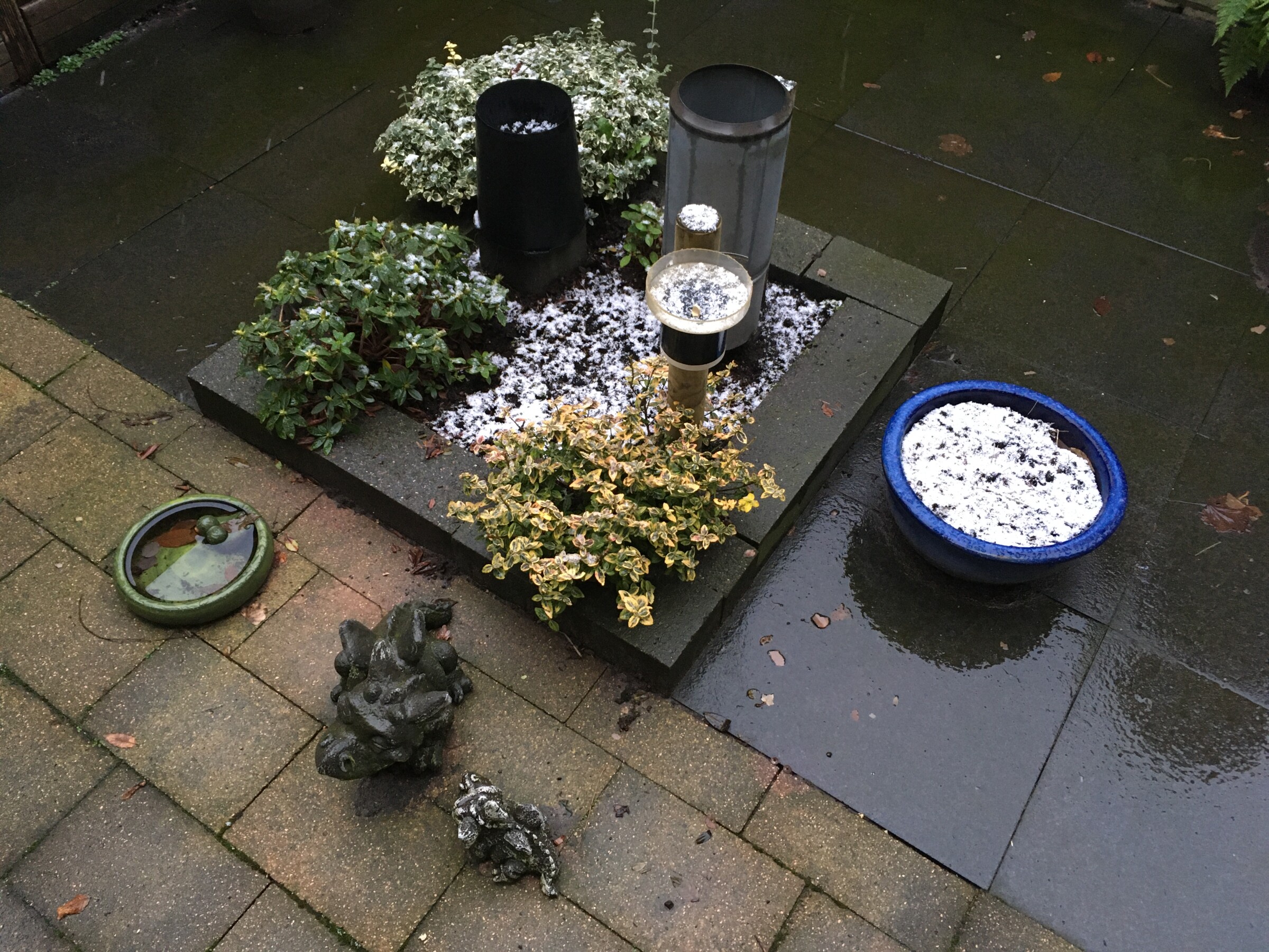 Toch strategisch behoorlijk diep in het 'code oranje' gebied gelegen, had ik stilletjes op wat meer gehoopt, al waren meerdere modellen voor deze omgeving ook niet zo positief. Rond 9 uur sneeuwde het een tijdje bijna matig met dit 'sneeuwdek' (zie foto) als resultaat. Strikt naar Bennekom kijkend, zou dit zelfs nog niet eens 'code geel' waardig zijn, want op straat ligt uiteraard niets.