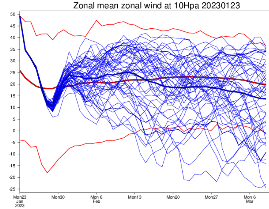 De zonale winden zijn ten opzichte van de vorige run gemiddeld sterker geworden