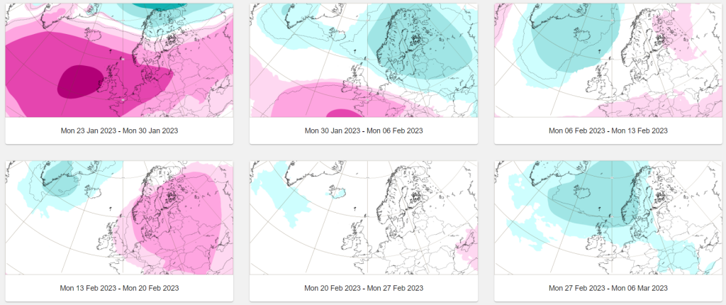Hogedruk wat nu sterk is ten westen van ons, verplaatst zich in eerste instantie zuidwaarts. Lagedruk ten noorden van ons bepaalt dan het weer. In februari zien we tijdelijk wat hogere druk boven Scandinavië