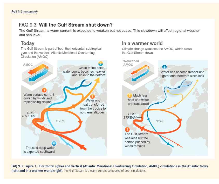 De golfstroom zal niet stoppen als gevolg van klimaatverandering. Het is wel de verwachting dat deze zal verzwakken als gevolg van de vermindering van de dichtheid van het oceaanwater door smelt van de Groenlandse IJskap.