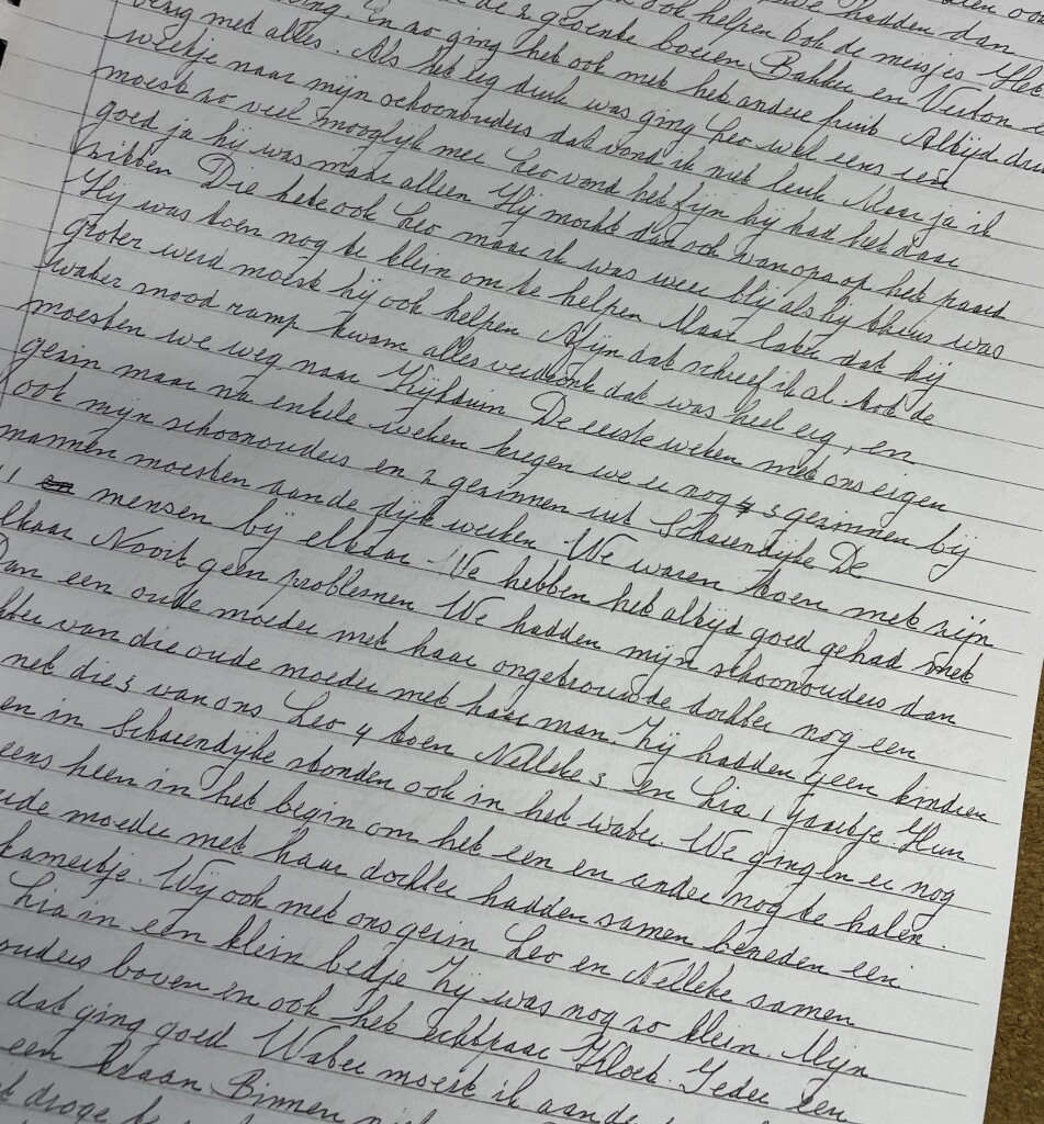 Daar kwam ik op het strand en wat zag ik? Allemaal ijsschotsen. En wat hadden die twee een plezier: van de ene schots op de andere. Maarja, het was ook eb en vloed en met eb zouden ze meegesleurd worden. Ik schrok me naar, en riep: "Nelleke, Leo, kom terug!” En ze hoorden het, en kwamen, wat was ik blij. Wij terug: het was toen al aardig duister. We waren afgedwaald en konden moeilijk de weg terug vinden. Ik moest ze ieder aan een hand een beetje meesleuren door de troep en doorns. Gelukkig droegen ze alle twee een lang broekje. Maar ze huilden niet en we kwamen toch thuis. Lia lag lekker te slapen. Ik voelde me een ontaarde moeder. Ik had ze niet naar het strand moeten laten gaan en dan die weg terug naar huis. Ik voelde me erg schuldig maar was blij dat ik ze nog had."