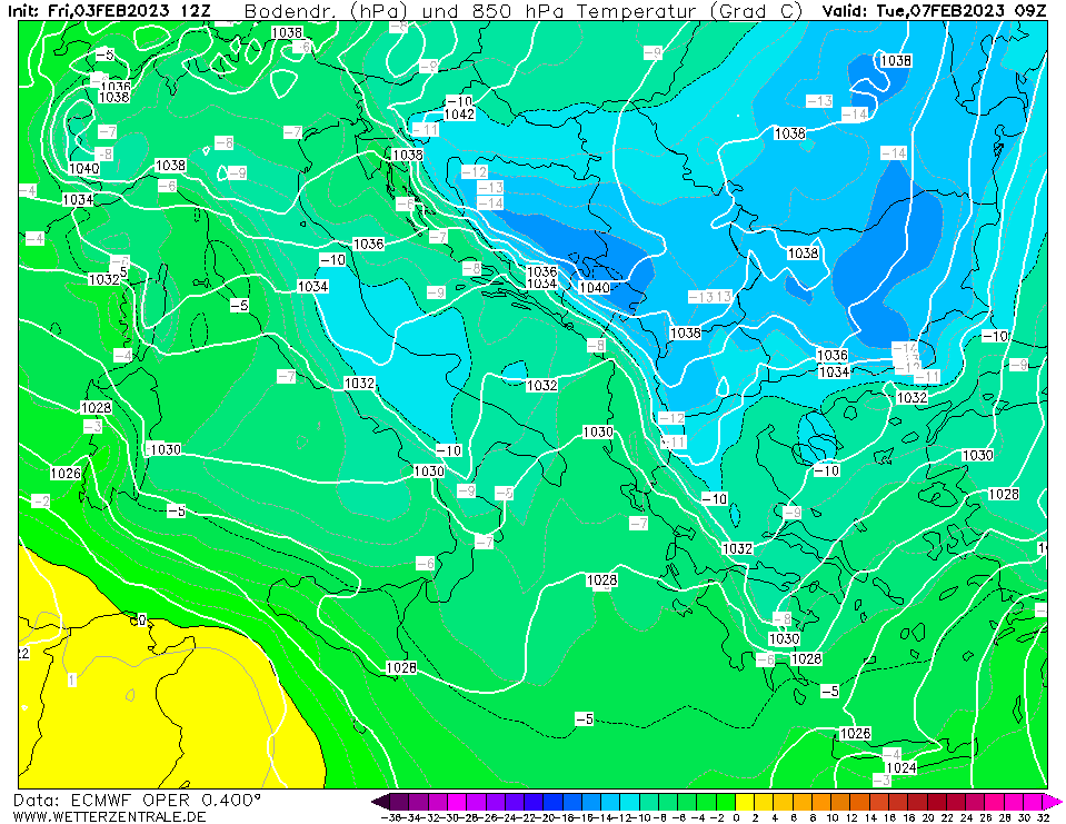 T850 zakt richting -7 tot -10°, met op uitgebreide schaal lichte tot matige nachtvorst. In de binnenlanden vanaf enige hoogte tijdelijk kans op lichte sneeuw en maxima rond of net boven het vriespunt. Voor een echte winterveeg met veel sneeuw is de druk net te hoog.
