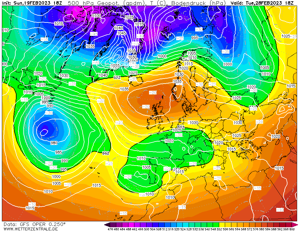 Sterke rugvorming want de vortex gaat uiteindelijk ten noorden van Groenland oostwaarts.