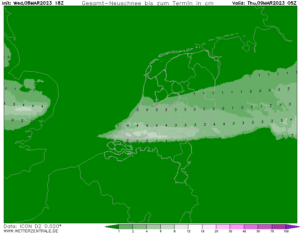 leken me sappige regenbuien achter het front, maar ICON maakt er voor het midden sneeuw van vannacht. Totaal t/m morgenochtend: