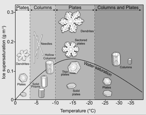Uit onderstaand afbeelding blijkt dat ijsplaatjes ontstaan bij strenge vorst (temperaturen tussen -10 en -22 graden maar bij lagere temperaturen ook). Maar belangrijker is de luchtvochtigheid, die mag niet te hoog zijn, want dan worden de ijskristallen dendrieten en die spiegelen niet. Maar bij lagere luchtvochtigheid zullen ze sublimeren.