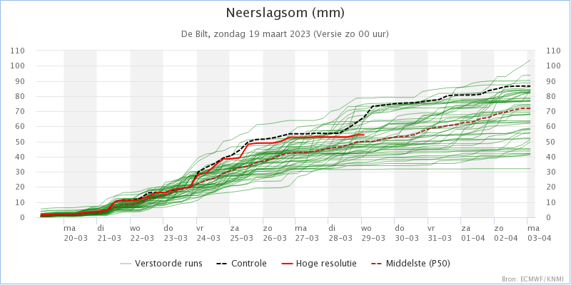 Weerpluim van het KNMI - De meeste berekeningen binnen de weerpluim voor De Bilt laten t/m 31 maart nog eens 40 tot 80 mm neerslag zien.