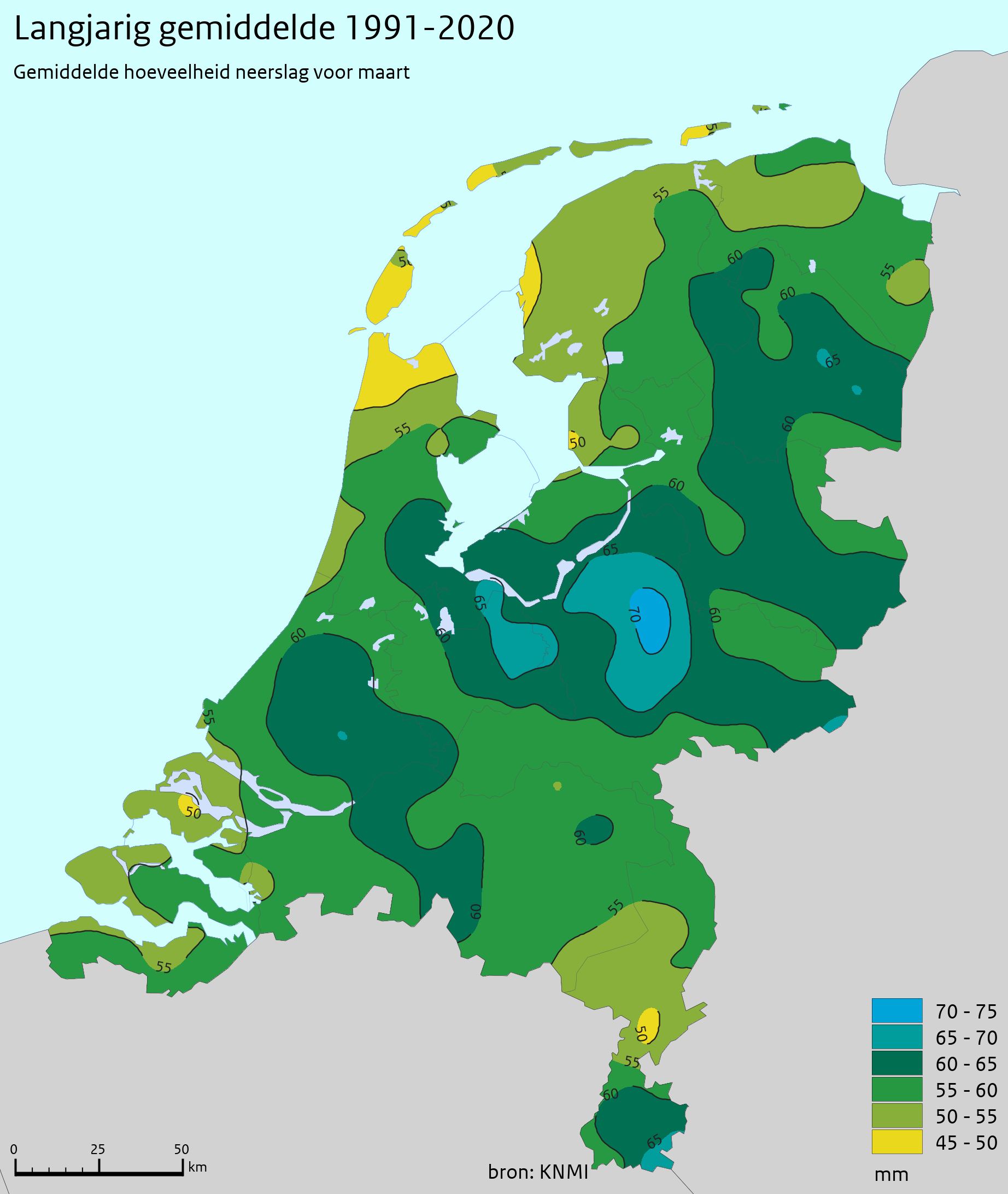 Kaart van het KNMI - Gemiddelde hoeveelheid neerslag in de maand maart voor de periode 1991 - 2020.