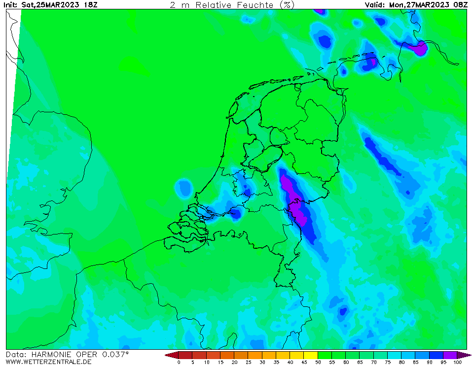 Misschien berekent Harmonie in die koude lucht teveel verdamping boven het IJsselmeer? De stroming volgt precies het wateropervlak naar het zuidzuidoosten. Daardoor kan de lucht (in de berekening) vochtiger worden, wat later dan mistvorming geeft.