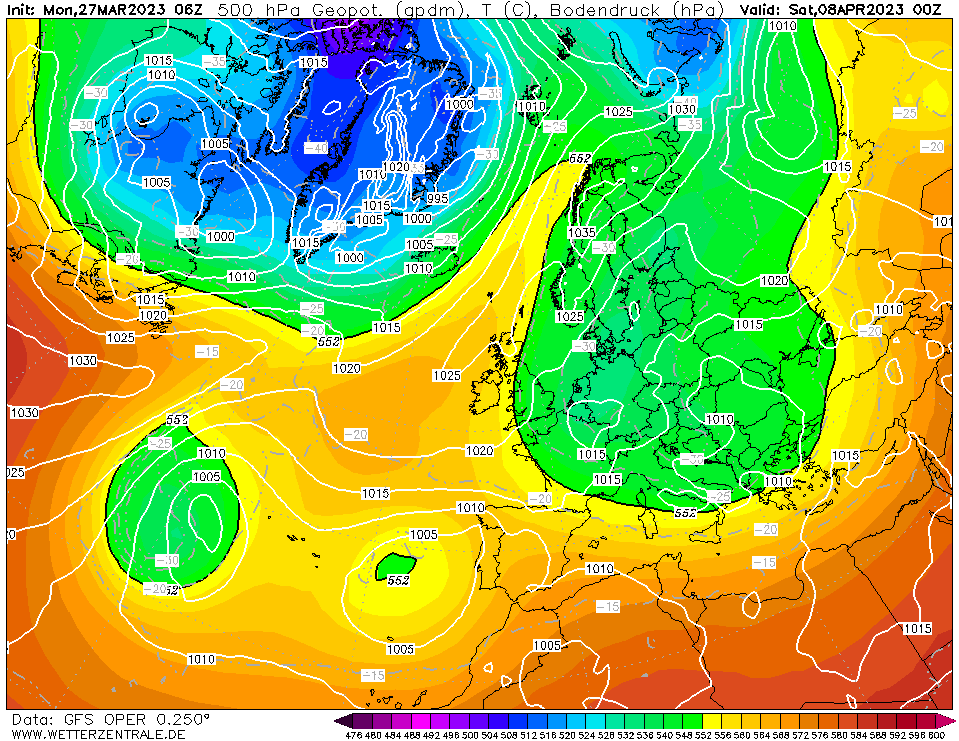 Als dit scenario (Oper 06z) uitkomt zit je nog eens wekenlang met het huidige weertype opgezadeld met lichte vorst in de nacht en overdag niet eens dubbele cijfers. Het geduld is al zo lang op. Vorig jaar was de batterij al op 20 procent. Eind maart 2023 is onderhand de batterij-spaarstand ingeschakeld om die 2 procent nog even vast te houden voordat hij uitvalt.