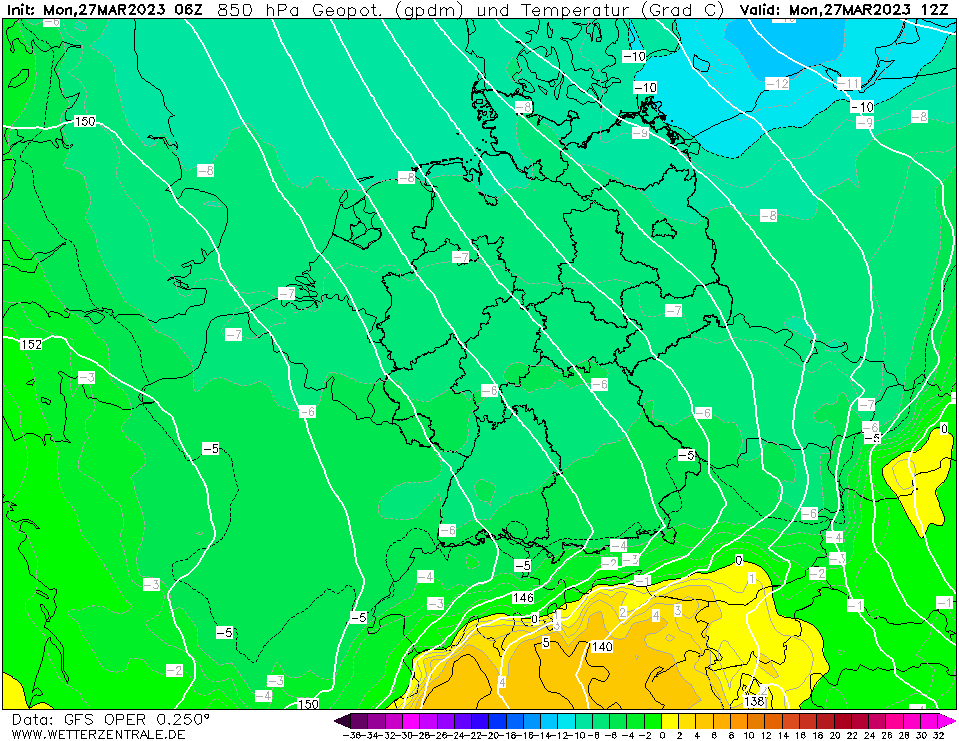 De verwachte temperaturen en dauwpunten komen overeen met de metingen dus daar ligt het waarschijnlijk niet aan. Maar als we dan de T850 bekijken dan zien we dat het Harmonie model met -2 tot -3°C komt terwijl bijv. GFS en een recente radiosonde meting -7 tot -8°C laten zien. Als dat T850 kaartje van Meteociel echt klopt (is trouwens 5 km resolutie variant i.p.v. 2.5 km, maar bewolkingspatroon is hetzelfde), dan lijken die te warme bovenluchten een verklaring te zijn waarom de buiigheid onderschat wordt door Harmonie.