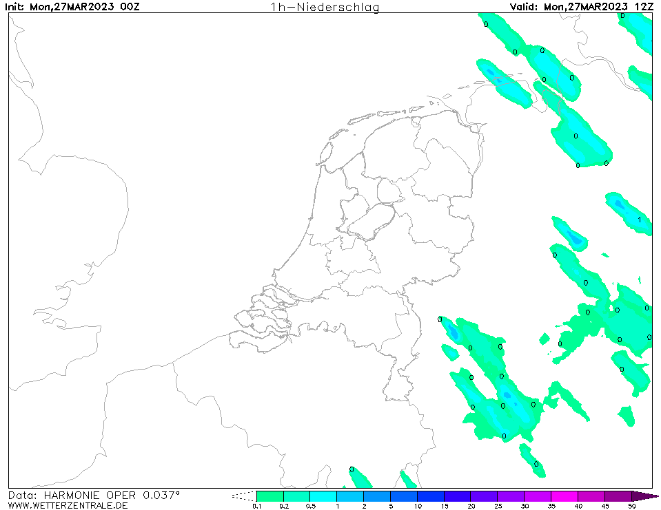 De actueel lichte en relatief ondiepe buien die van over de Noordzee worden aangevoerd worden door met name de Harmonies grotendeels gemist. EC geeft het allemaal beter weer. Diepste convectie met de daarbij horende zwaarste windstoten blijven beperkt tot de oostelijke Noordzee. Timing van de neerslag morgenmiddag in EC iets sneller dan in de Harmonies. Harmonies zijn duidelijk wat droger in de grenslaag waardoor de eerste neerslag nog grotendeels verdampt. Ook goed te zien in het verschil tussen cappi- en neerslagplaatjes van Harmonie.