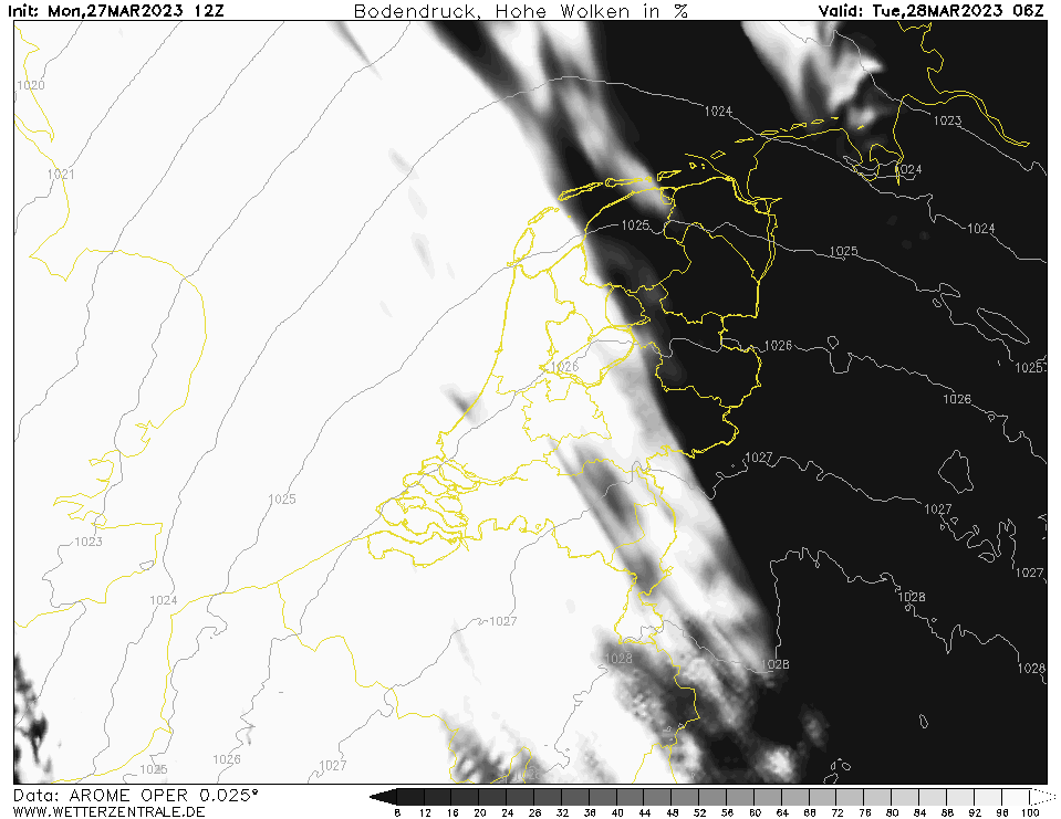 Volgens ICON D2 en Arome komen de hoge wolken in de nanacht over een deel van de Benelux, waardoor het kwik in de ochtend stilaan wat kan stijgen ipv richting -3° zakken boven de zandgronden.