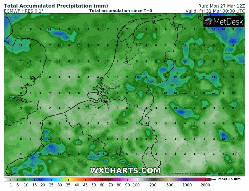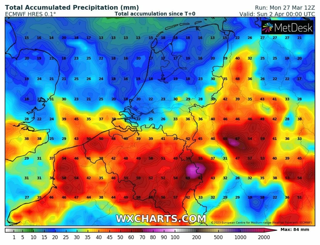 In Nederland veelal 10 - 30 mm in 48 uur tijd. De neerslag van vrijdag komt nog bovenop de al (zeer) hoge neerslagsom van de maand maart op veel plekken.
