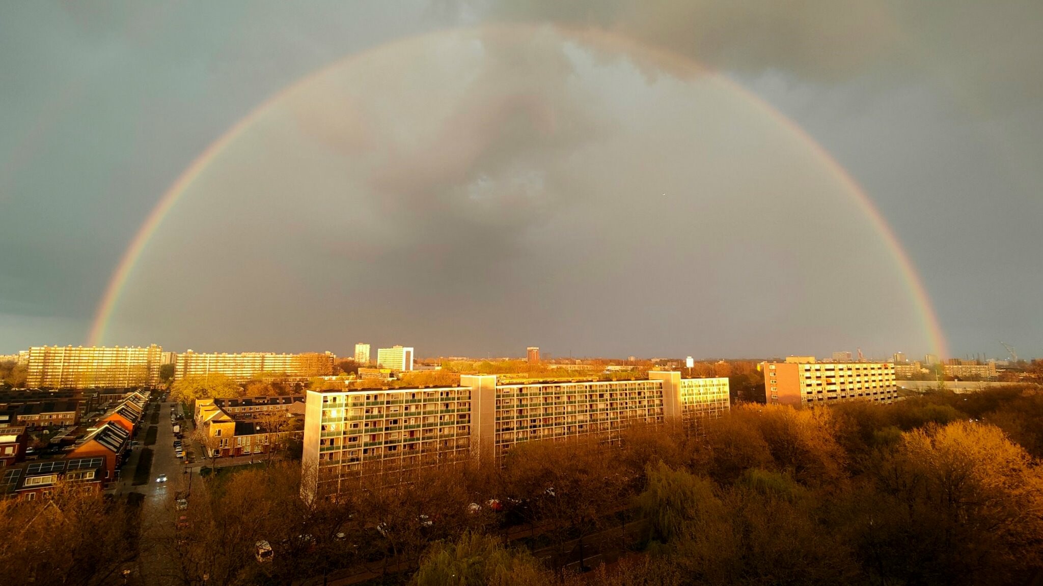 Wel prachtig zicht op de regenboog! Vlaardingen in de zon, Schiedam/Rotterdam in de regen.