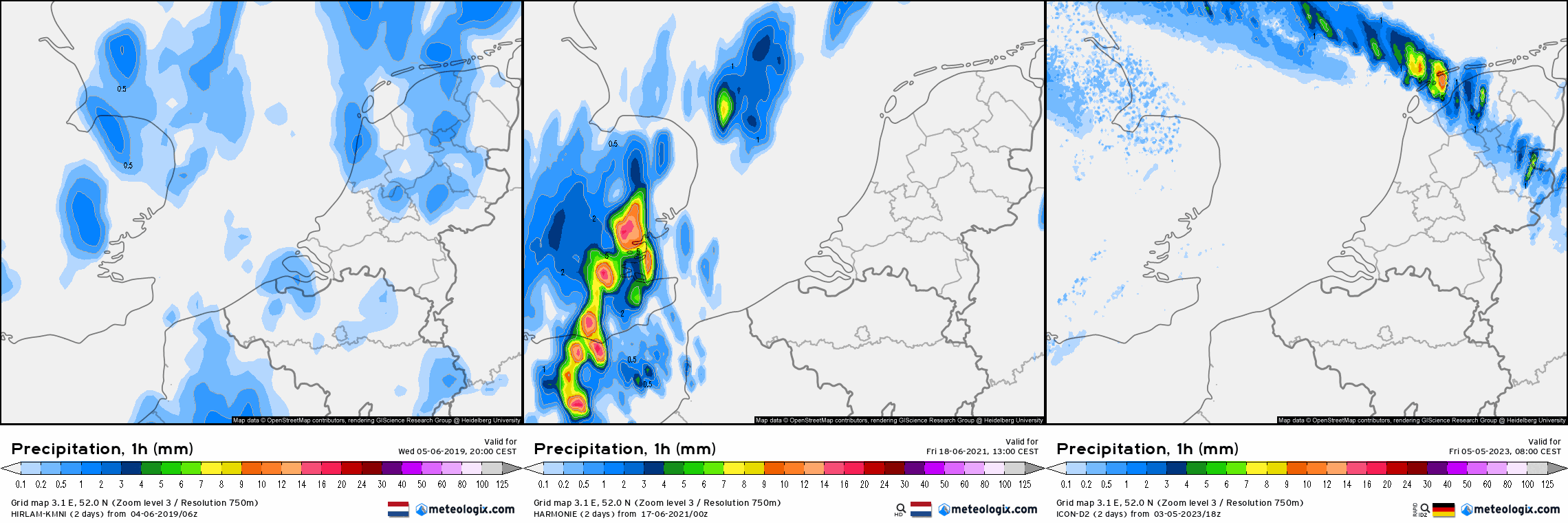 Ik dacht, misschien is het eens interessant om drie fijnmazige weermodellen naast elkaar te zetten voor convectieve situaties. Helemaal links is HIRLAM te zien, één van de eerste fijnmazige weermodellen voor onze regionen die t/m juni 2020 werd gebruikt door o.a. het KNMI. In het midden is de opvolger van dat model te zien, HARMONIE, dat nu wordt gebruikt door het KNMI voor korte-termijn verwachtingen. Rechts is ICON-D2 te zien, een opvolger van het vroegere COSMO door de DWD. Toch leuk om te zien hoe zoiets zich heeft ontwikkeld, los van de setting/situatie.