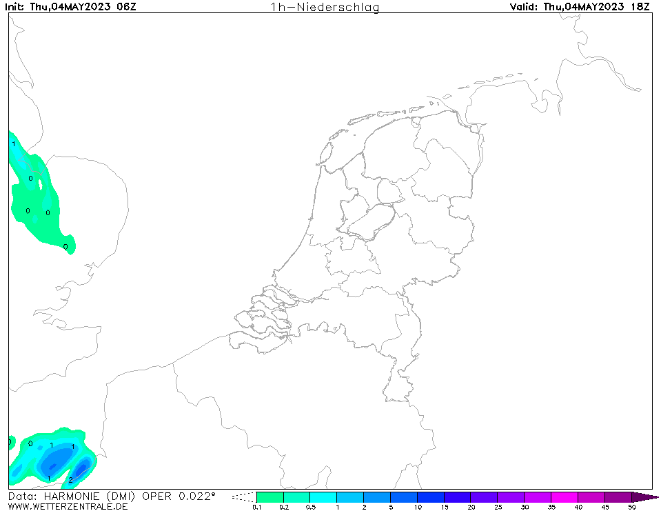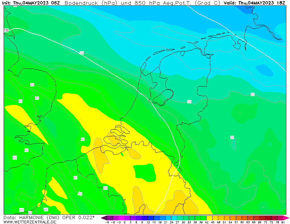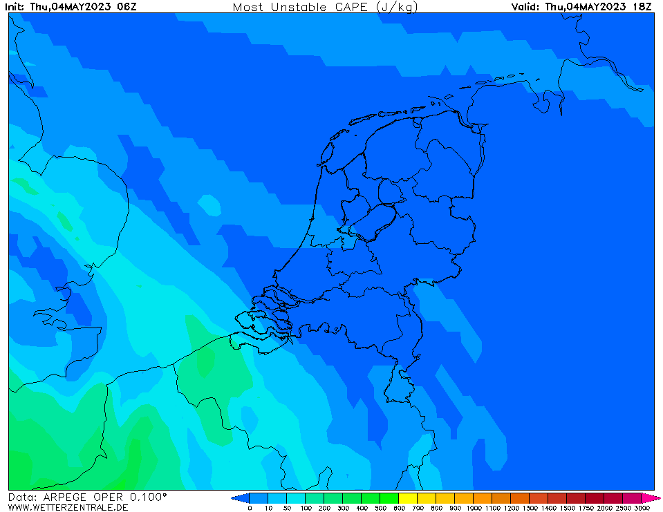 Donderdagmiddag ligt een NW-ZO georiënteerde vore (langwerpig ondiep lagedrukgebied) in een brede tong met warme lucht boven Frankrijk. Daarachter wordt er vanuit het zuidwesten vochtige en zachte maritiem subtropische lucht aangevoerd. Hierin ontstaan later vanmiddag boven de NW kust van Frankrijk enkele stevige buien. Mogelijk weten deze buien vanavond laat West-Vlaanderen en de westkust van NL te bereiken, al laten sommige modellen de buien deactiveren of de Noordzee optrekken, waar ze vanaf middelbaar niveau gevoed worden. Op 300 hPa is er boven de westelijke Noordzee een kortgolvige trog te zien die de buienactiviteit daar ’s nachts mogelijk mede in stand zou kunnen houden.