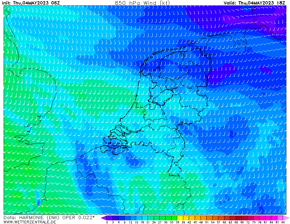 Toenemende convergentie op 850 hPa aan eind van de nacht boven het noordoosten: