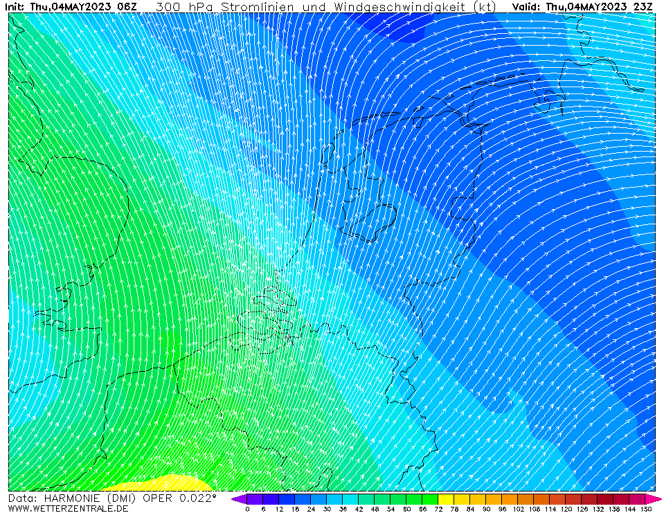 En dan de trog op 300 hPa boven Engeland en de westelijke Noordzee. Ik denk niet dat we hier veel aan zullen hebben maar voor de volledigheid toch maar erbij: